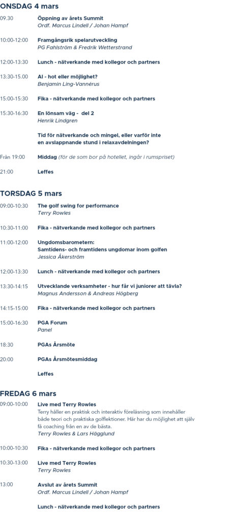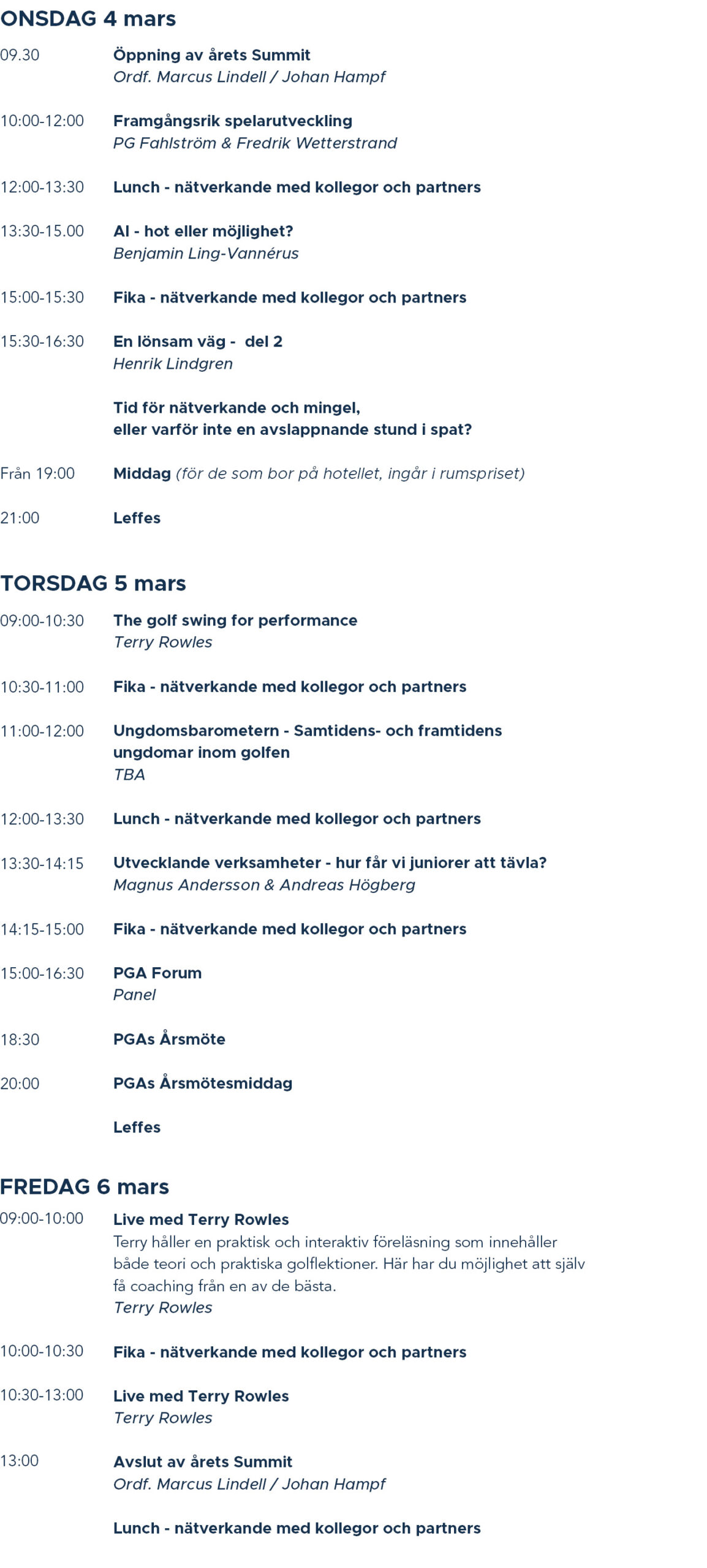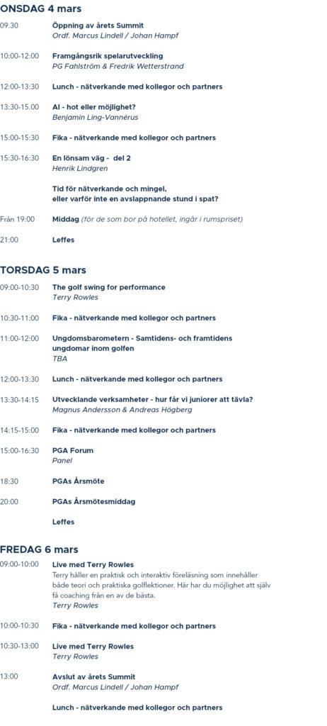 Kursavgiften för PGA Summit 2026 är 2.695 kr exkl. moms och betalas mot faktura från PGA.